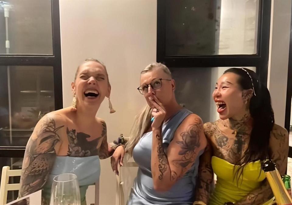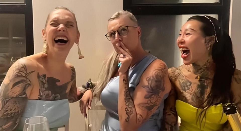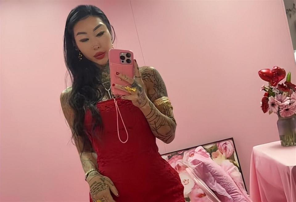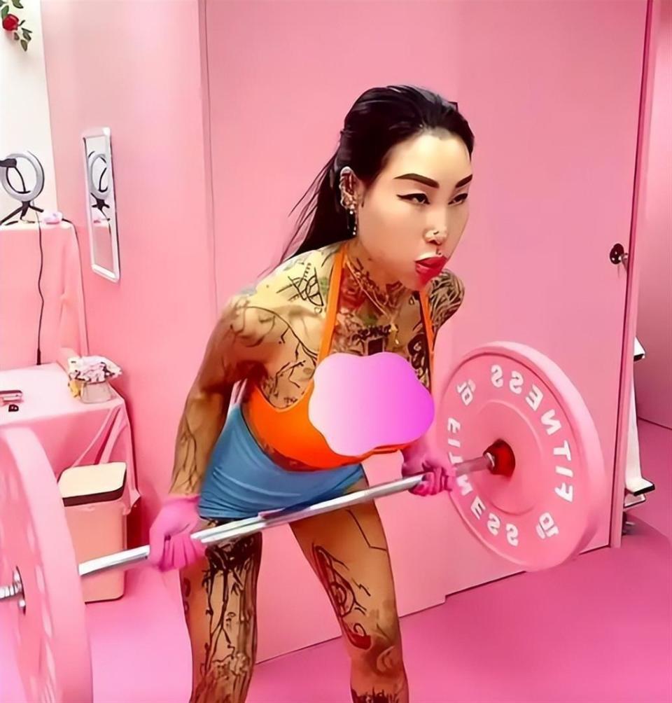 纹身也是那时候上头的。 一开始就胳膊上纹个小图案,后来腿上、背上、肚子上全整上了,除了脸,全身几乎没一块干净地儿。 她自己也说没啥规划,看着好看的图案就往上加,到2024年接受采访时候说,这些年纹身花了整整100万港币 。
